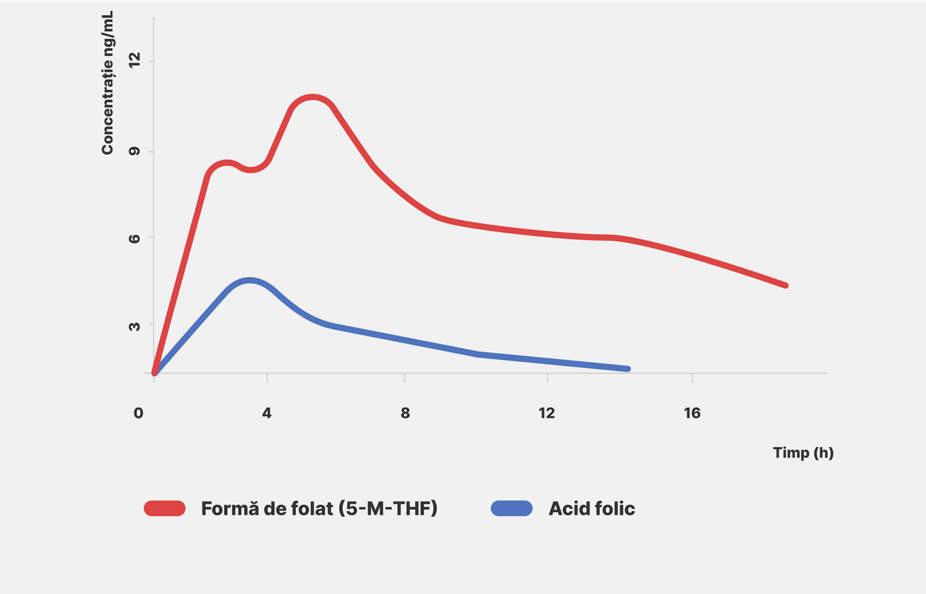 Comparație a absorbției acidului folic (FA) și a folatului activ (5‑MTHF) în sânge [1]